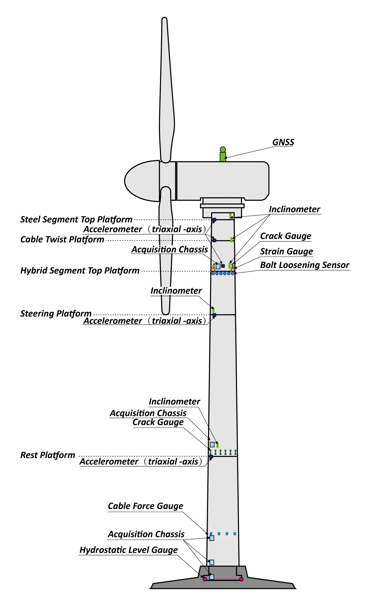 Ved at installere relevante sensorer på vindmølletårne til tilstandsovervågning bør det vigtigste overvågningsindhold for vindmølletårnets strukturelle komponenter omfatte: tårnvibrationsovervågning, tårnhældningsovervågning, spændingsovervågning af den øverste overgangssektion, tårnkroppsrevneovervågning, overvågning af tårnforskydning, overvågning af tårnfundamentsætning, overvågning af kabelkraft for at opnå sikker drift af vindmøllen osv.